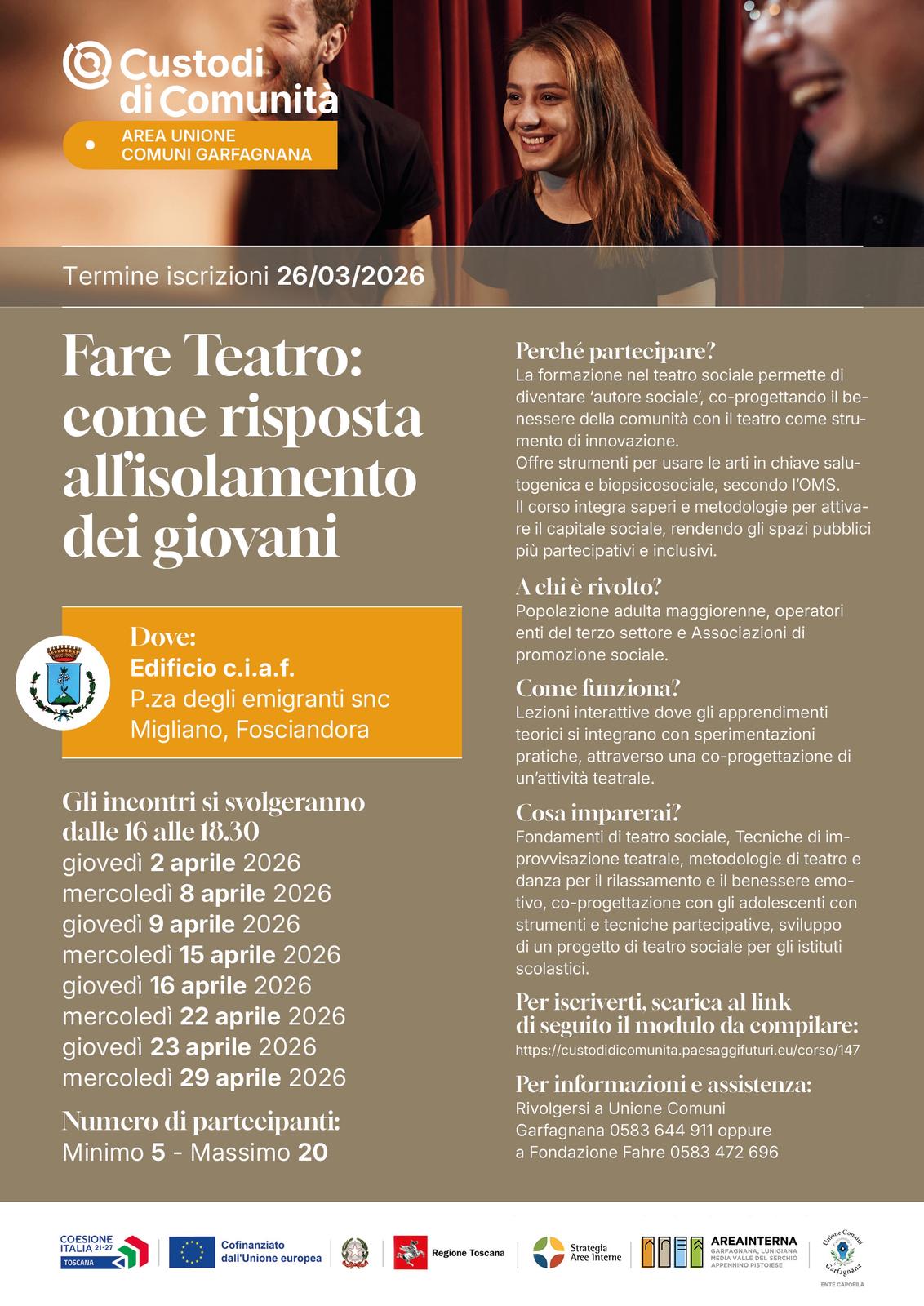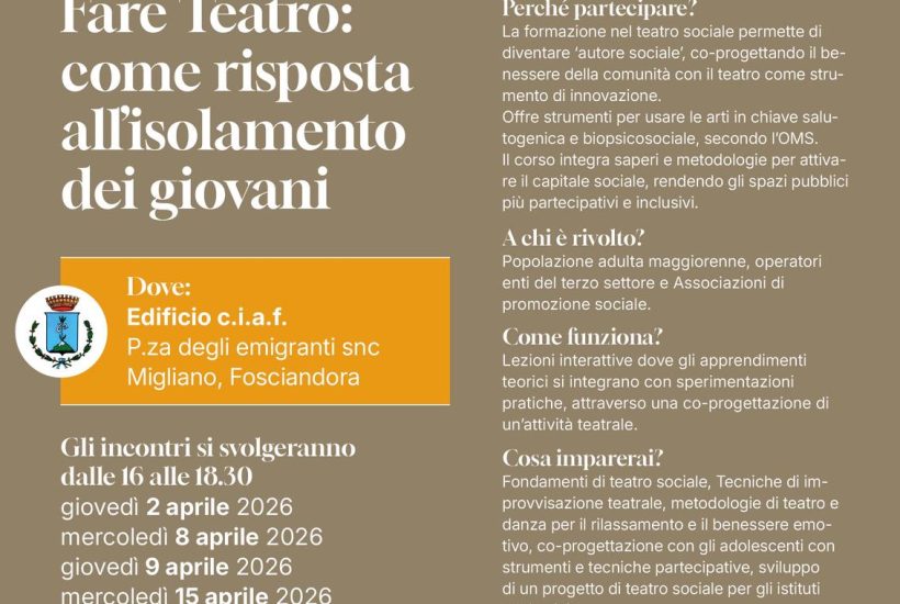 Dopo il successo dei primi due corsi dedicati a welfare culturale e archivistica, è in partenza il nuovo ciclo di incontri “Fare Teatro: come risposta all’isolamento dei giovani” presso la sede Ciaf “Vladimiro Zucchi” a Migliano di Fosciandora. Un totale di otto lezioni interattive (2, 8, 9, 15, 16, 22, 23 e 29 aprile), dalle ore 16 alle ore 18.30, per apprendere i fondamenti del teatro sociale, attraverso apprendimenti teorici e sperimentazioni pratiche, ed offrire strumenti per usare l’arte in chiave salutogenica e biopsicosociale.