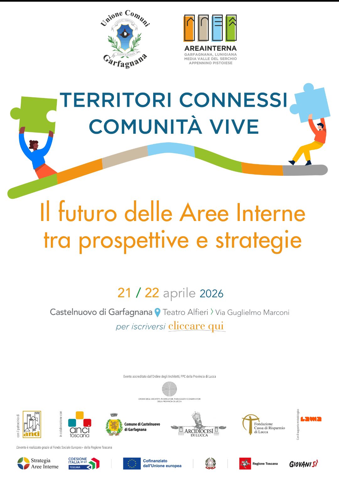 Martedì 21 e mercoledì 22 aprile l’Unione Comuni Garfagnana, in qualità di Ente capofila per l’attuazione della Strategia di Area Interna “Garfagnana – Lunigiana – Media Valle del Serchio – Appennino Pistoiese”, organizzerà il convegno “Territori connessi, comunità vive: il futuro delle Aree Interne tra prospettive e strategie” presso il Teatro Alfieri di Castelnuovo di Garfagnana.
