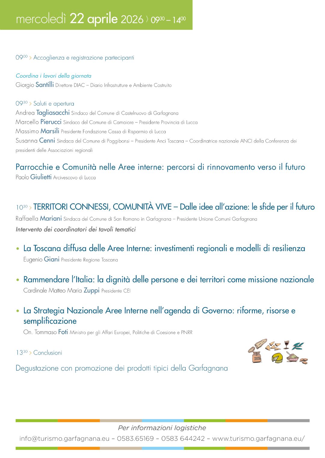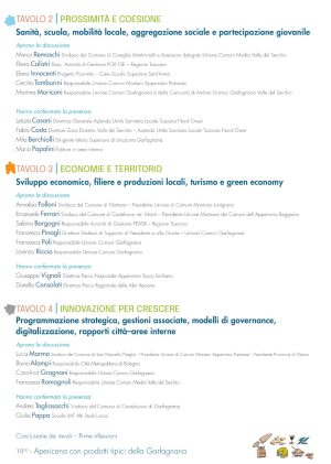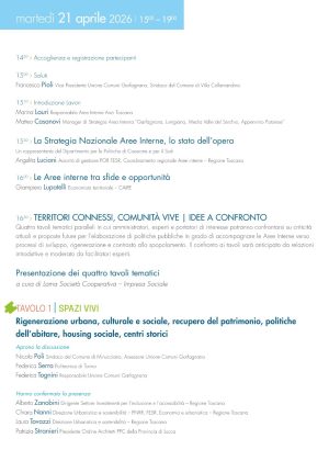 Interverranno, quindi, i coordinatori dei tavoli tematici. Poi la parola passerà ai relatori: il Presidente della Regione Toscana Eugenio Giani parlerà della “Toscana diffusa” delle Aree Interne, passando in rassegna gli investimenti regionali e soffermandosi sui modelli di resilienza; il Cardinale Matteo Maria Zuppi, Presidente della C.E.I., toccherà il tema della dignità delle persone e dei territori come missione nazionale; l’On. Tommaso Foti illustrerà, infine, la Strategia Nazionale Aree Interne nell’agenda di Governo tra riforme, risorse e semplificazione. Dopo le conclusioni, i partecipanti potranno prendere parte ad una degustazione con promozione dei prodotti tipici del territorio.