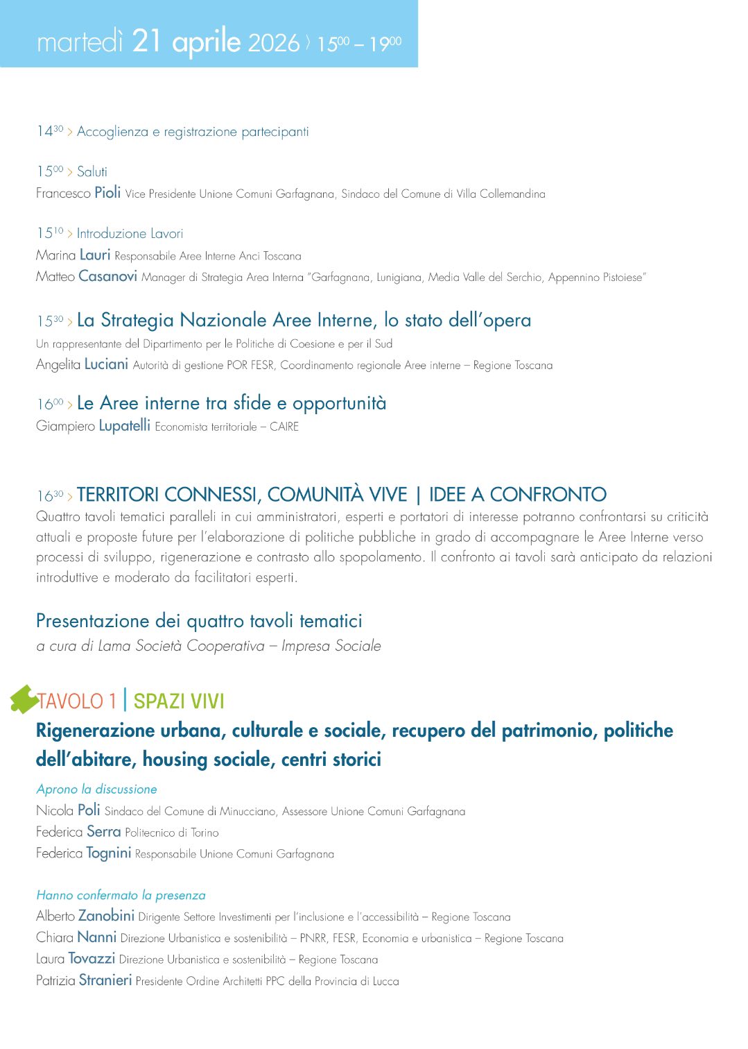 L’Arcivescovo di Lucca Mons. Paolo Giulietti interverrà con un focus su Parrocchie e Aree interne, concentrandosi sui percorsi di rinnovamento verso il futuro. Raffaella Mariani, Sindaca del Comune di San Romano in Garfagnana e Presidente dell’Unione Comuni Garfagnana, entrerà invece nel vivo del dibattito soffermandosi sulle azioni portate avanti sul territorio e guardando alle sfide future.