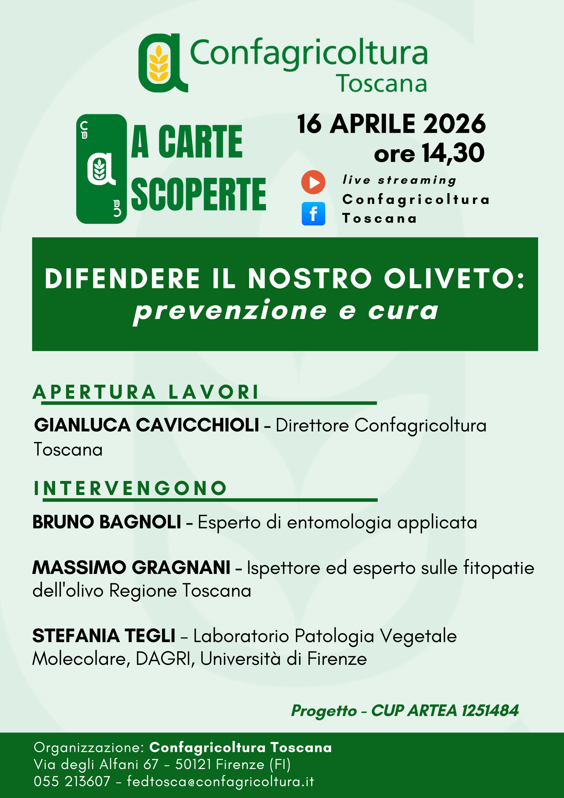 A portare contributi tecnici e indicazioni operative saranno Bruno Bagnoli, esperto di entomologia applicata, Massimo Gragnani, ispettore ed esperto sulle fitopatie dell’olivo della Regione Toscana e la prof.ssa Stefania Tegli, Laboratorio Patologia Vegetale Molecolare, del Dipartimento di Scienze e Tecnologie Agrarie, Alimentari, Ambientali e Forestali dell’Università di Firenze.